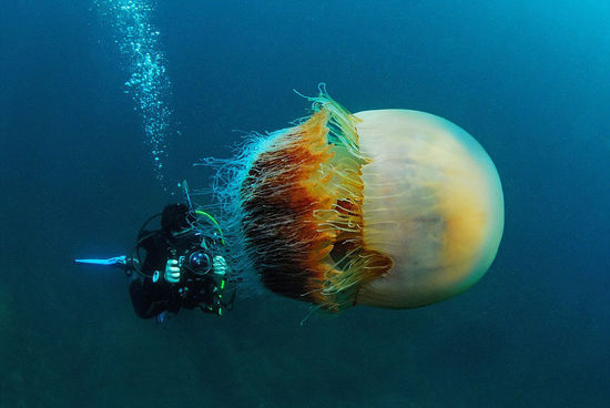 图中向人们展示了一只巨大的“野村水母”,这是巴西摄影师露西娅·特瑞在日本越前海岸潜水时拍摄的。